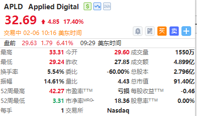 英伟达持仓概念强势上扬,APPLIED DIGITAL $APLD 涨超19%,CoreWeave大涨11%,NEBIUS涨超8%。
