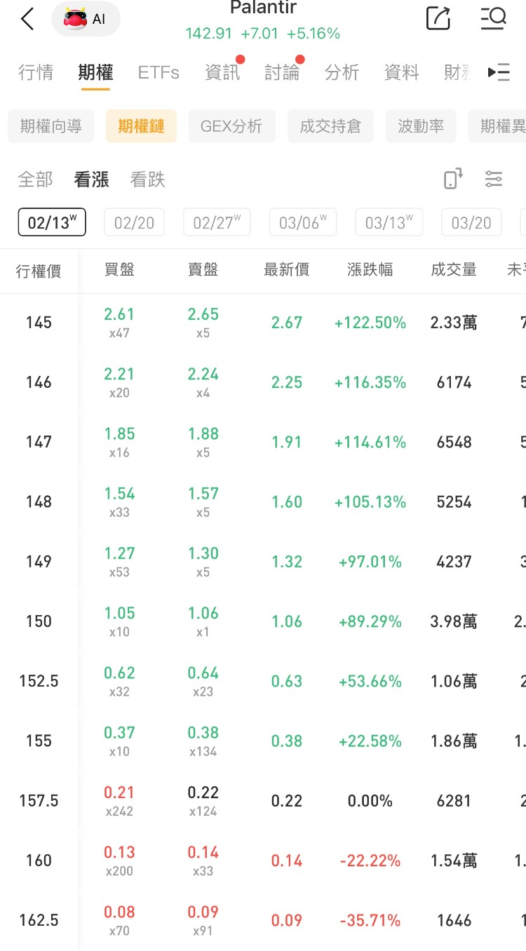 其中一看涨期权(PLTR_260213_C_150.0)交易量达3.98万张,该合约行权价为150.0美元,行权日在2026-02-13,该张期权涨89.29%。