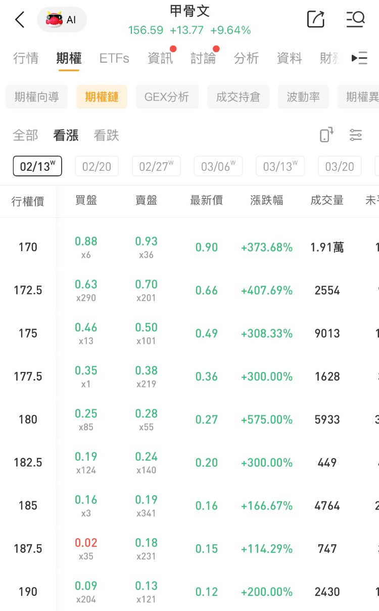 其中一看涨期权(ORCL_260213_C_170 )交易量达1.91万张,该合约行权价为170美元,行权日在2026-02-23,该张期权涨373.68%。