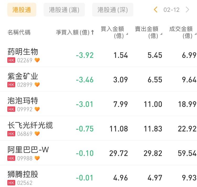 药明生物、紫金矿业、泡泡玛特分别遭净卖出3.92亿港元、3.46亿港元、3.01亿港元。