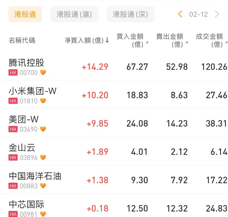 腾讯控股、小米集团-W、美团-W分别获净买入14.29亿港元、10.2亿港元、9.85亿港元;