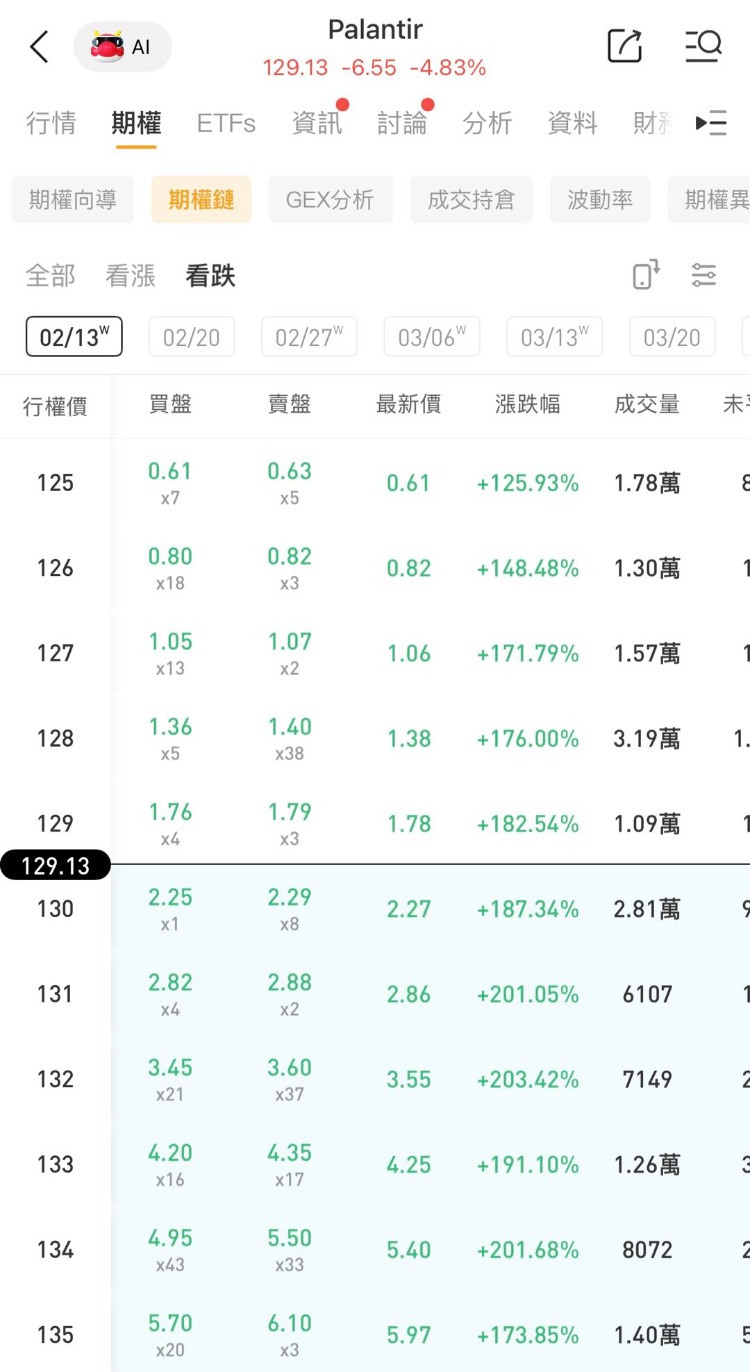 其中一看跌期权(PLTR_260213_P_128.00 )交易量达3.19万张,该合约行权价为128.0美元,行权日在2026-02-13,该张期权涨176%。