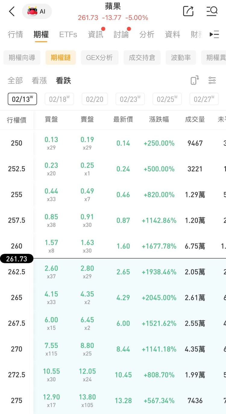 其中一看跌期权(AAPL_260213_P_260.00 )交易量达6.75万张,该合约行权价为260.0美元,行权日在2026-02-13,该张期权涨1677.78%。