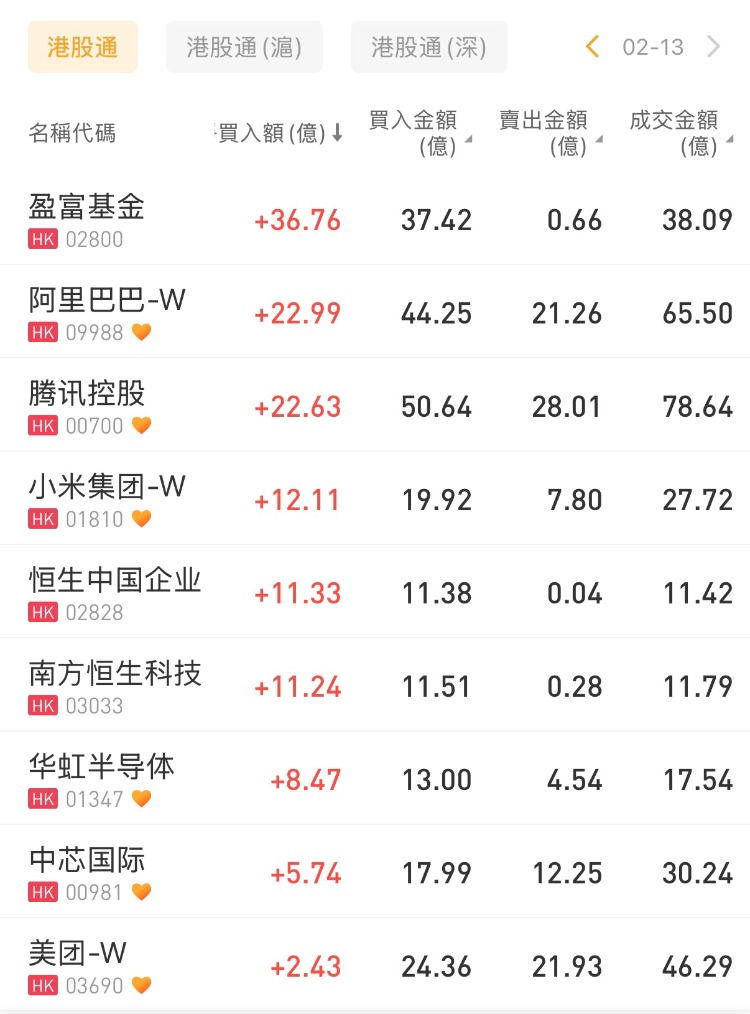 盈富基金、阿里巴巴-W、腾讯控股分别获净买入36.76亿港元、22.99亿港元、22.63亿港元;