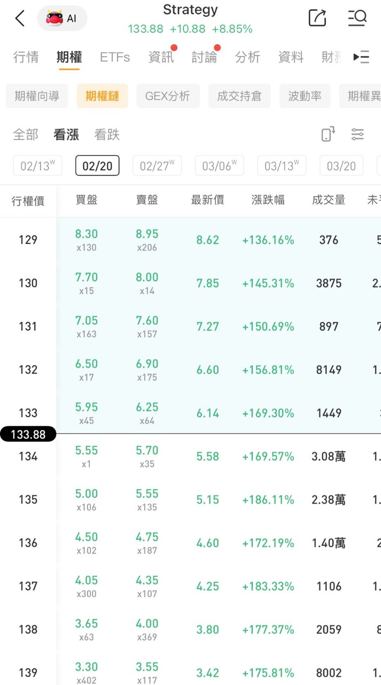 其中一看涨期权(MSTR_260220_C_135.0)交易量达2.38万张,该合约行权价为135.0美元,行权日在2026-02-20,该张期权涨186.11%。