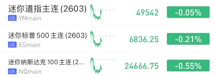 华盛资讯2月17日讯,美股三大期指盘前走低,截止发稿,道指期货 $YMmain 跌0.05%,纳指期货 $NQmain 跌0.55%,标普500指数期货 $ESmain 跌0.21%。