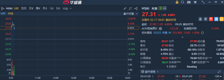 禾赛盘初一度大涨超9%,现涨约6%;据报宇树两款人形机器人搭载禾赛旗下激光雷达。