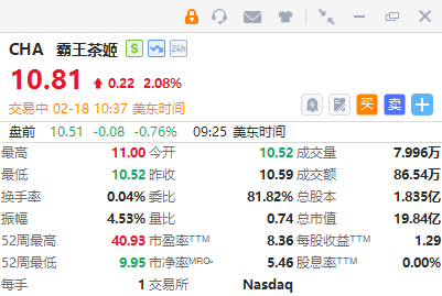 华盛资讯2月18日讯,霸王茶姬涨超2%,摩根大通首予霸王茶姬持有评级,目标价11.5美元;