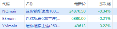 美股三大期指盘前齐跌,纳指期货 $NQmain 跌0.34%,标普500期货 $ESmain 跌0.21%,道指期货 $YMmain 跌0.22%。