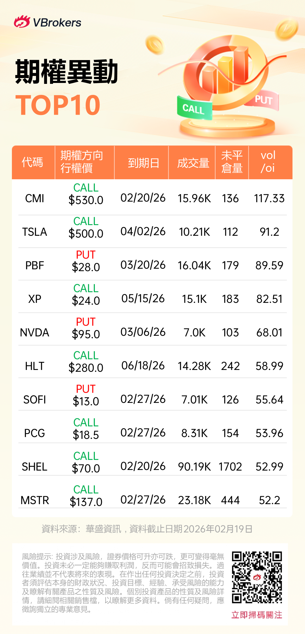 - 一看涨期权(CMI_260220_CALL_530.0 )Vol/OI 比率高达117.33,成交量达1.6万张,未平仓量136张,行权价为530.0美元,行权日在2026-02-20,该张期权涨2.08%。