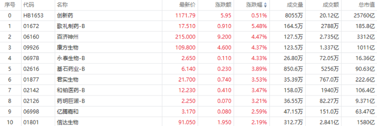 华盛资讯2月20日讯,港股创新药概念股普涨,歌礼制药-B涨超5%,百济神州、康方生物涨超4%,君实生物涨超3%,信达生物涨超2%。