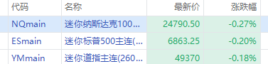 美股三大期指盘前齐跌,纳指期货 $NQmain 跌0.27%,标普500期货 $ESmain 跌0.2%,道指期货 $YMmain 跌0.18%。