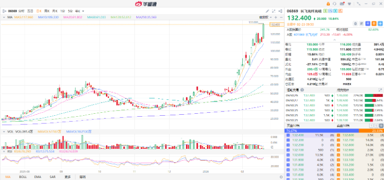 华盛资讯2月23日讯,港股光通信概念股再度飙升,长飞光纤光缆涨超18%再创新高,市值突破1000亿港元,年内已累计涨超150%;汇聚科技涨超7%,剑桥科技涨超4%。