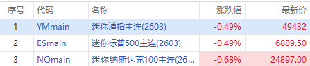 美伊地缘冲突叠加特朗普加码关税,美股三大期指盘前走低,纳指期货 $NQmain 跌0.67%,标普500期货 $ESmain 跌0.48%,道指期货 $YMmain 跌0.48%。