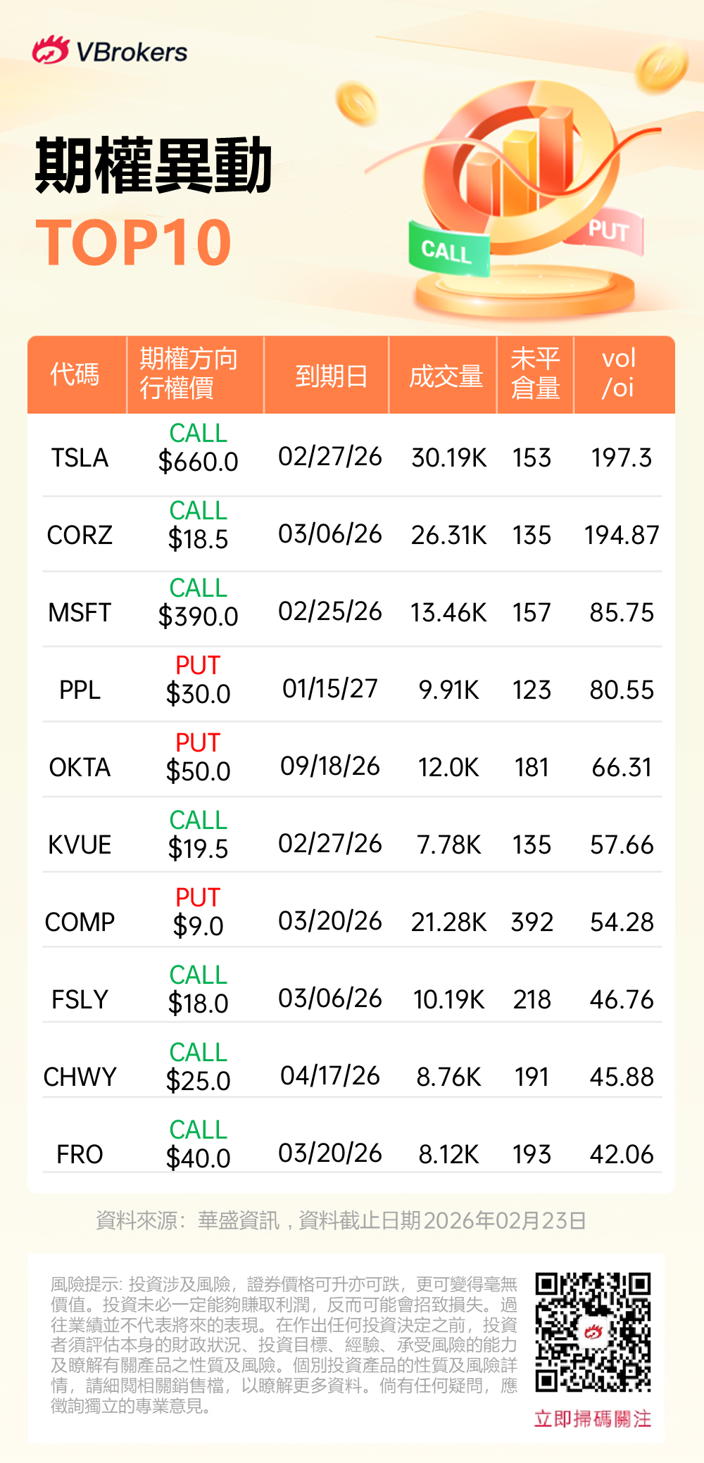 - 一看涨期权(TSLA_260227_CALL_660.0 )Vol/OI 比率高达197.3,成交量达3.02万张,未平仓量153张,行权价为660.0美元,行权日在2026-02-27。