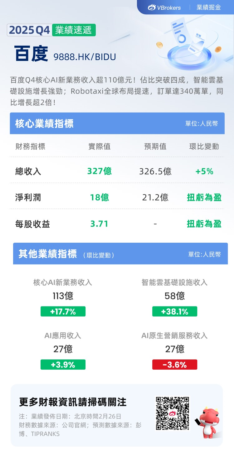 华盛资讯2月26日消息,百度 $09888.HK / $BIDU 今日公布截至2025年12月31日止的第四季度业绩。