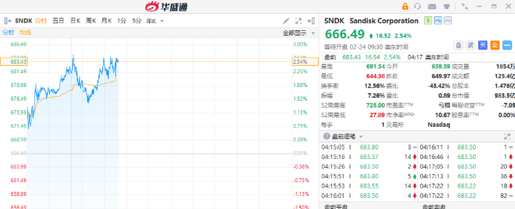 华盛资讯2月24日讯,美股三大期指盘前小幅反弹,纳指期货微涨0.11%,存储概念走高,SanDisk $SNDK 涨超2%,美光科技、西部数据跟涨。