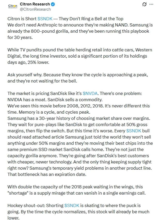 打个比方:做空$SNDK就像是滑向冰球运动的终点。等到市场周期恢复正常时,这支股票的价格已经跌得更低了。