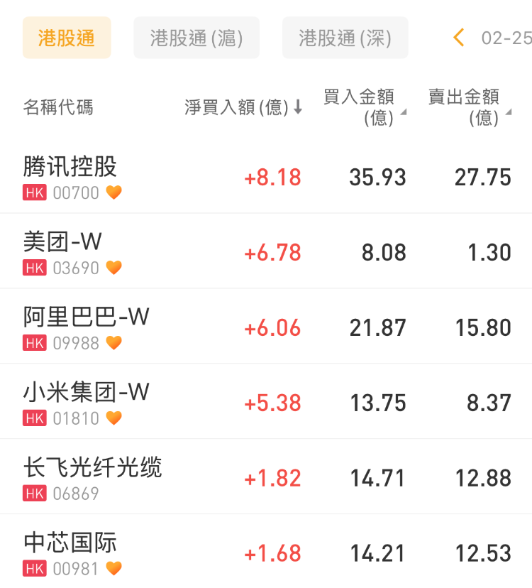 腾讯控股、美团-W、阿里巴巴-W分别获净买入8.18亿港元、6.78亿港元、6.06亿港元;