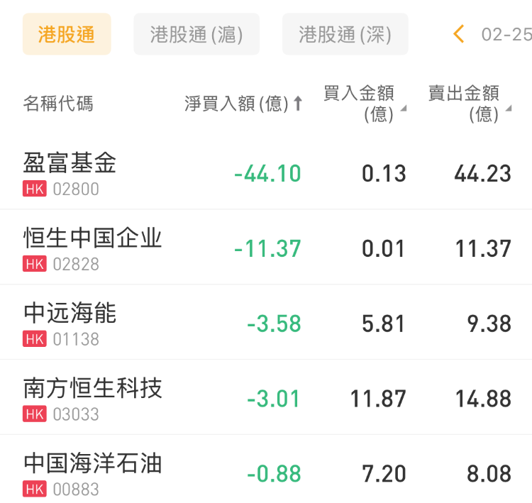 盈富基金、恒生中国企业、中远海能分别遭净卖出44.1亿港元、11.37亿港元、3.58亿港元。
