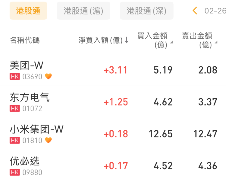美团-W、东方电气、小米集团-W分别获净买入3.11亿港元、1.25亿港元、1835万港元;