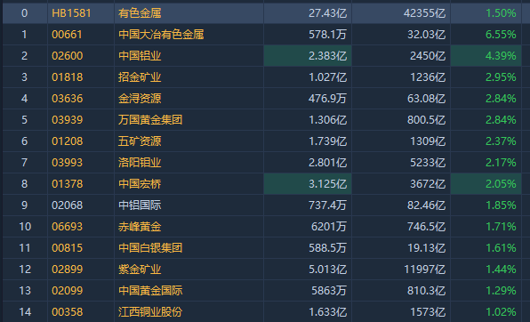 华盛资讯2月27日讯,有色金属概念集体走高,中国铝业涨超4%,招金矿业涨近2%,金浔资源、万国黄金、五矿资源、洛阳钼业、中国宏桥涨超2%。
