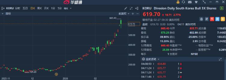 Direxion Daily South Korea Bull 3X Shares $KORU 是美股市场上非常激进的做多韩国股指的杠杆工具,该产品追踪MSCI韩国25/50指数,并提供三倍于该指数的回报,主要持仓包括三星、海力士、现代等50只韩国股票。在韩国股指持续上涨之时,该产品将提供非常高昂的市场回报。据华盛资讯统计,截止2月27日,KORU $KORU 年内涨幅已超240%,在年内涨幅可谓火箭发射。