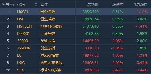港股方面,恒生指数周涨0.82%,报26630.54点;国企指数周跌1.12%,报8859.49点;恒生科技指数周跌1.41%,报5137.84点。