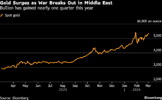 金价在早盘交易中一度上涨2.2%,触及每盎司5390美元上方,随后部分回吐涨幅。上周末,美国与以色列袭击伊朗并导致伊朗最高领袖阿亚图拉·阿里·哈梅内伊身亡,此后德黑兰方面以多轮导弹袭击多国目标作为回应,地区冲突进一步升级。