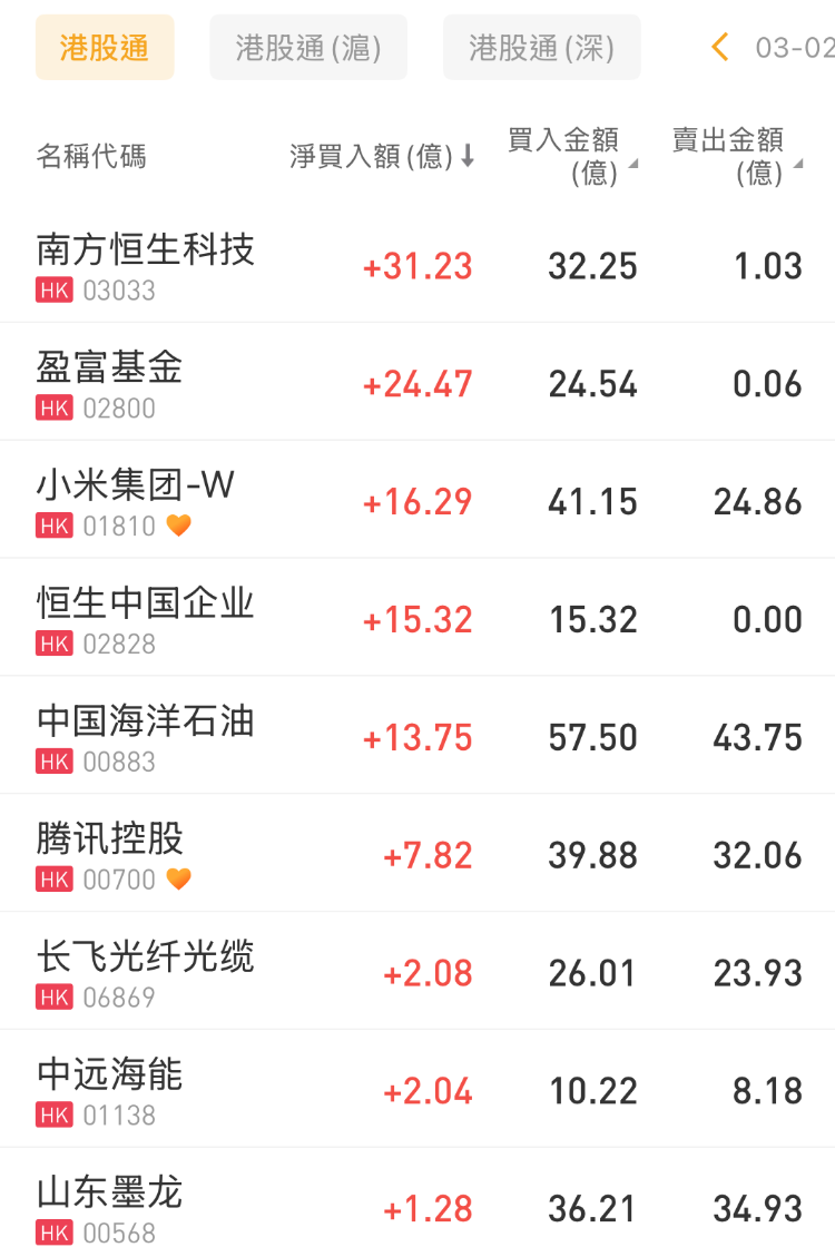 南方恒生科技、盈富基金、小米集团-W分别获净买入31.23亿港元、24.47亿港元、16.29亿港元;