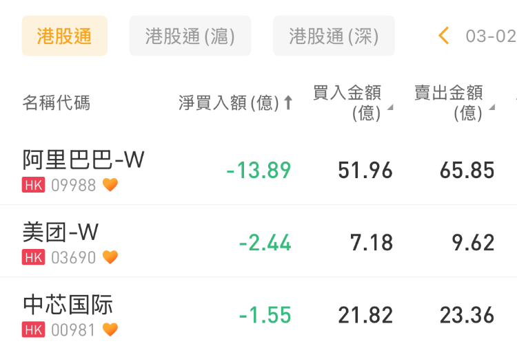 阿里巴巴-W、美团-W、中芯国际分别遭净卖出13.89亿港元、2.44亿港元、1.55亿港元。