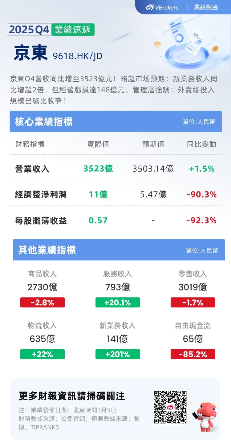 华盛资讯3月5日消息,京东 $09618.HK / $JD 公布截至2025年12月31日止的2025财年Q4业绩。