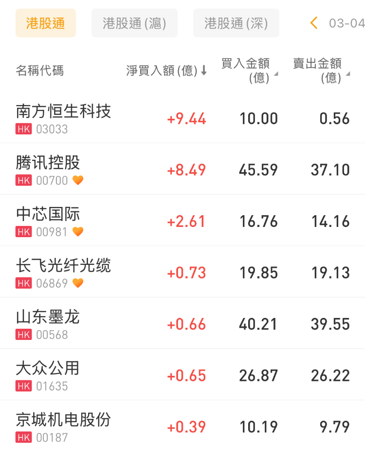 南方恒生科技、腾讯控股、中芯国际分别获净买入9.44亿港元、8.49亿港元、2.61亿港元;