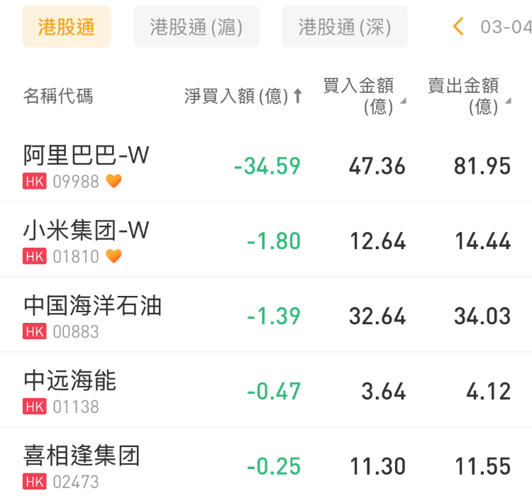 阿里巴巴-W、小米集团-W、中国海洋石油分别遭净卖出34.59亿港元、1.8亿港元、1.39亿港元。