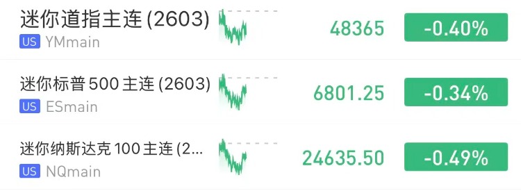 华盛资讯3月4日讯,美股三大期指盘前走低,纳指期货 $NQmain 跌0.49%,道指期货 $YMmain 跌0.40,标普500指数期货 $ESmain 跌0.34%。