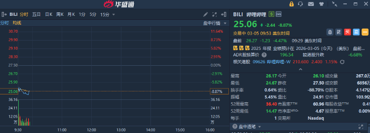 华盛资讯3月5日讯,热门中概股盘中普跌,哔哩哔哩一度重挫超10%,现跌近9%;公司Q4营收同比增长8%,经调整净利润增94%。