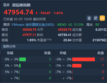 美东时间3月5日,美股三大指数全线下挫,道指盘中一度大跌超1100点,最终收跌1.61%,纳指收跌0.26%,标普500指数跌0.57%。