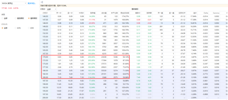 其中一看涨期权(NVDA_260309_P_175.00 )交易量达3.76万张,该合约行权价为170.00美元,行权日在2026-03-09,该张期权涨201.67%。