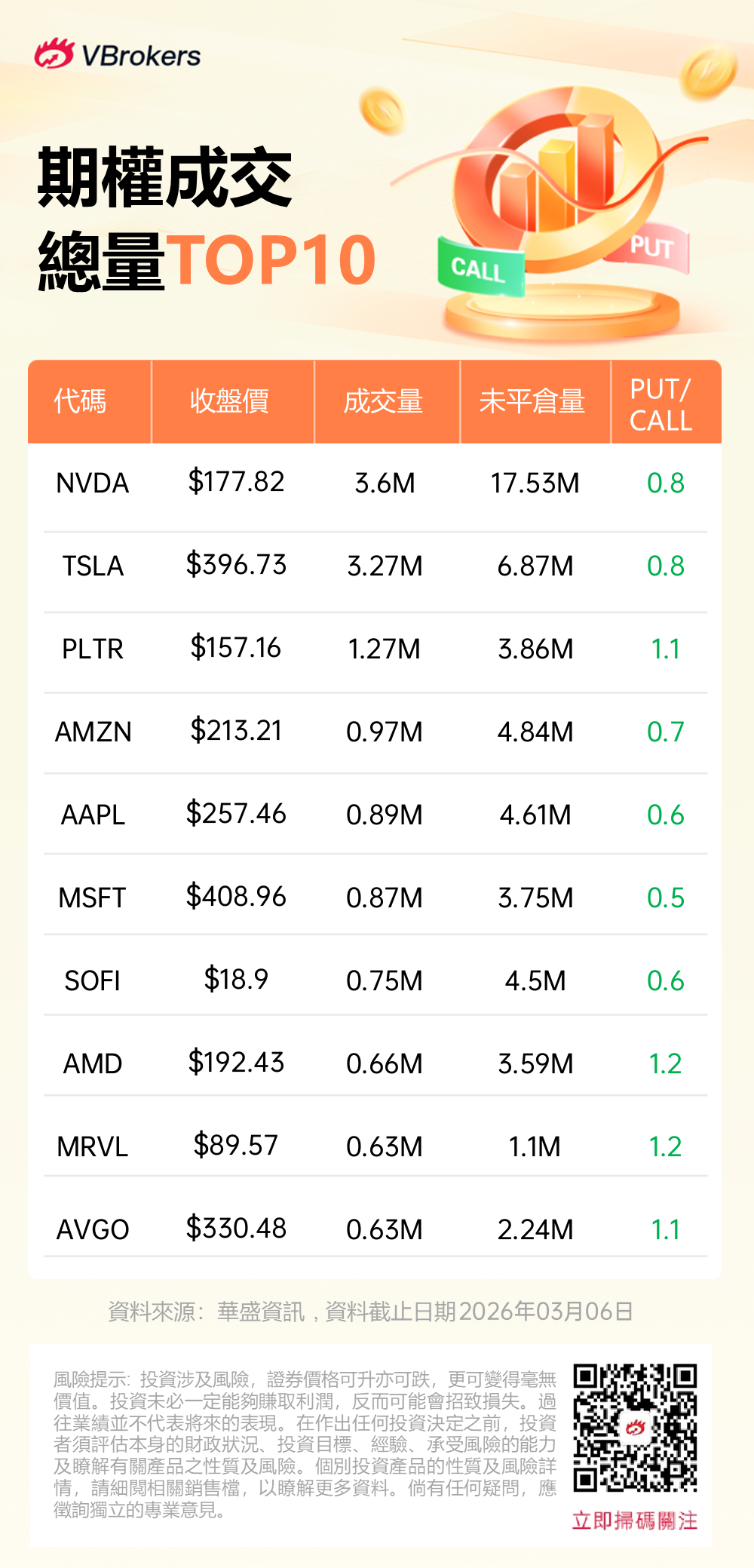 上周五个股期权成交量前十位分别为:英伟达、特斯拉、Palantir、亚马逊、苹果、微软、SoFi、美国超微公司、迈威尔科技、博通。