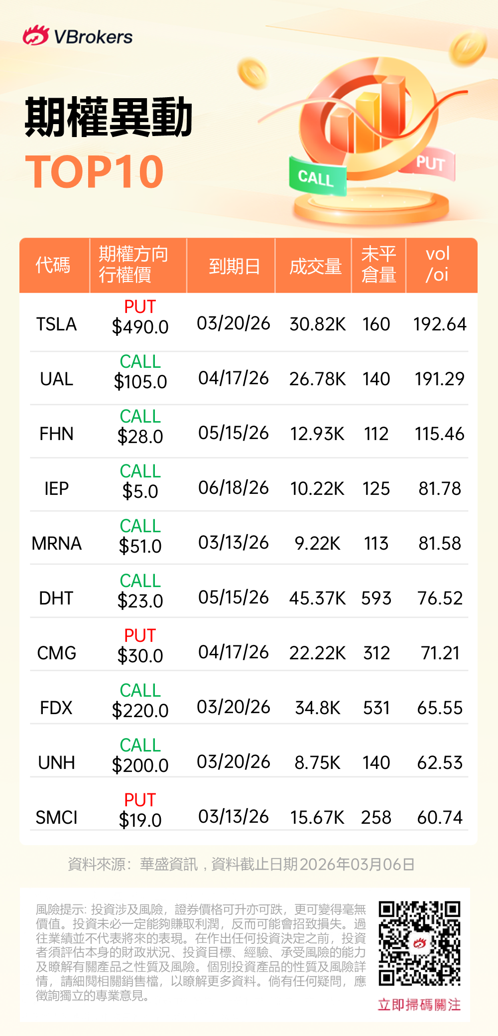 - 一看涨期权(UAL_260417_CALL_105.0 )Vol/OI 比率高达191.29,成交量达2.68万张,未平仓量140张,行权价为105.0美元,行权日在2026-04-17,该张期权跌23.71%。