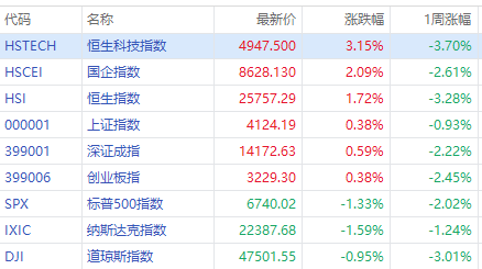 港股方面,本周恒生指数跌幅3.28%,报25757.29点;恒生科技指数跌幅3.7%,报4947.5点;国企指数跌幅2.61%,报8628.13点。