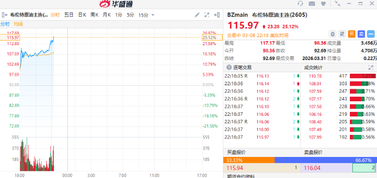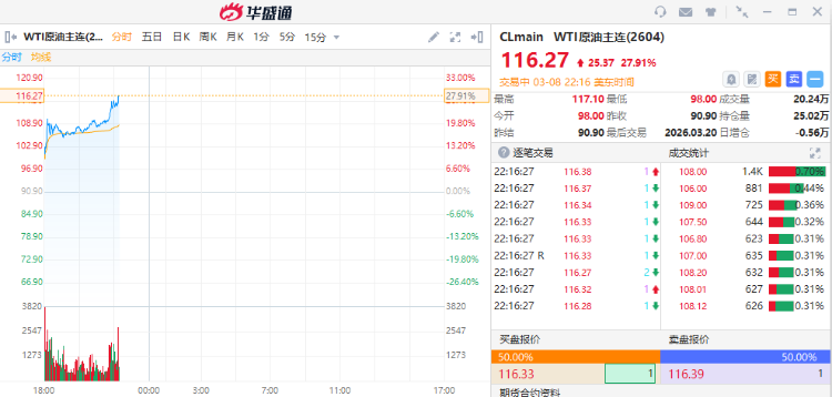 WTI原油期货 $CLmain 向上触及117.1美元/桶,最新报116.27美元/桶,日内上涨27.91%。布伦特原油期货 $BZmain 向上触及117.17美元/桶,最新报115.97美元/桶,日内上涨25.12%。而上一次油价突破每桶100美元大关,还是在2022年俄乌冲突爆发之后。