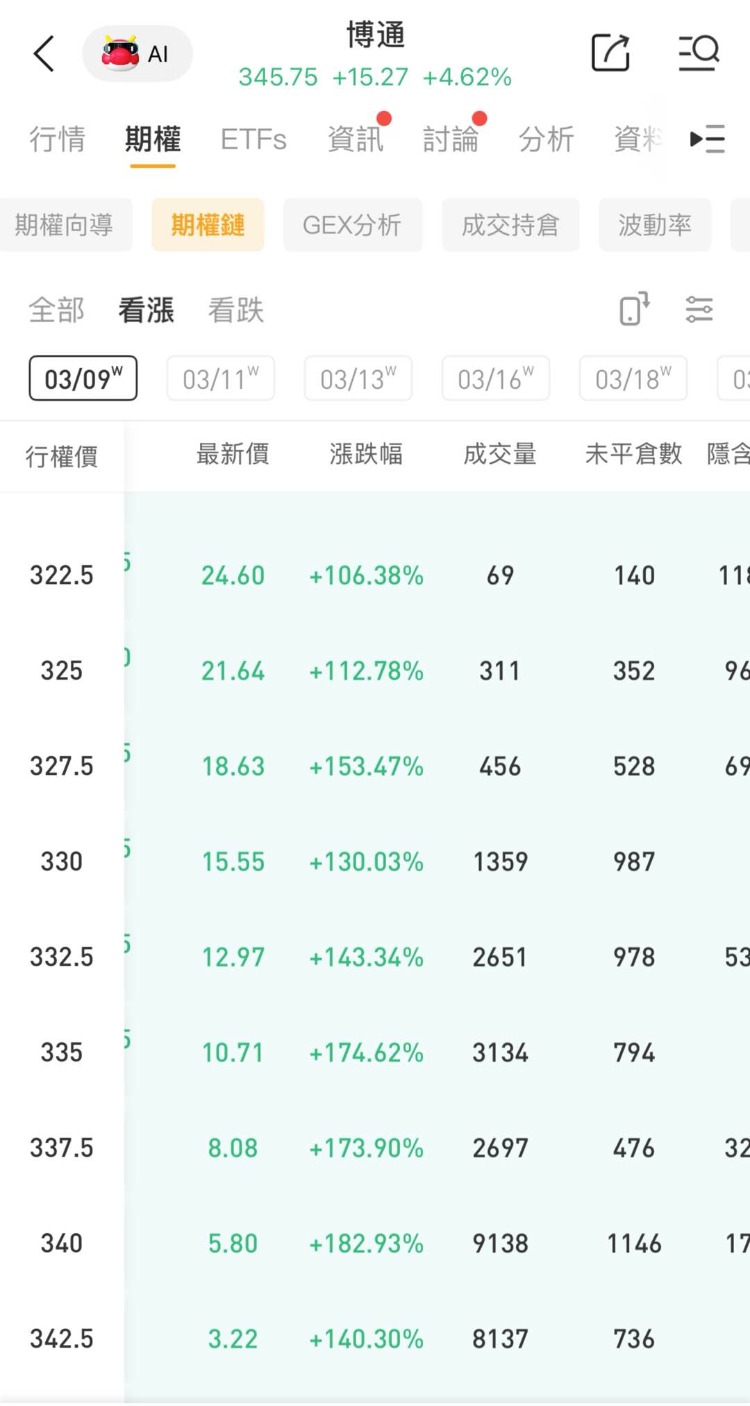多张价内期权涨超150%,其中一看跌期权(AVGO_260309_C_340.0 )交易量达0.9万张,该合约行权价为340美元,行权日在2026-03-09,该张期权张超182%。