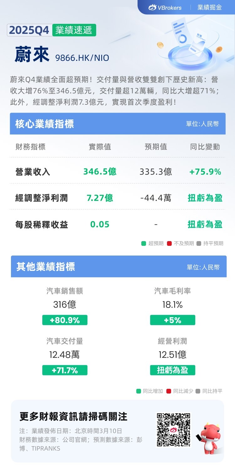 华盛资讯3月10日消息,蔚来 $09866.HK / $NIO 公布截至2025年12月31日止的2025财年Q4业绩。业绩公布后,蔚来美股盘前持续走高,截至发稿涨超7%。