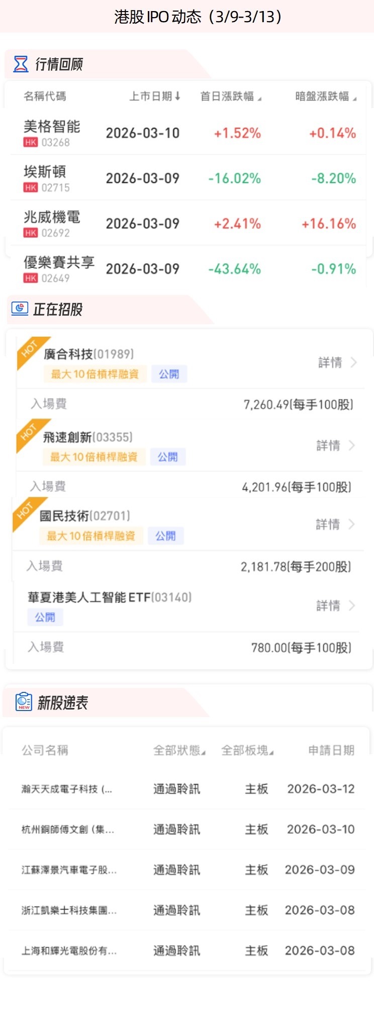 华盛资讯3月13日讯,本周4家港股新股上市,其中兆威机电、美格智能两只新股首日收涨;截至发稿,目前有广合科技、国民技术、飞速创新三只新股正在招股中,其中广合科技目前孖展认购倍数超61倍.