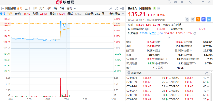 热门中概股多数走高,阿里巴巴涨近3%,腾讯音乐、哔哩哔哩、理想汽车、蔚来均涨超2%,拼多多涨近2%。