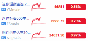 盘前,美股三大期指普涨,纳指期货 $NQmain 涨0.97%,标普500期货 $ESmain 涨0.79%,道指期货 $YMmain 涨0.56%。