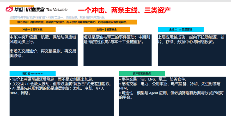 - 主线一:能源安全——短期看油价与军工,中期看“确定性供电”与本土工业链重估;