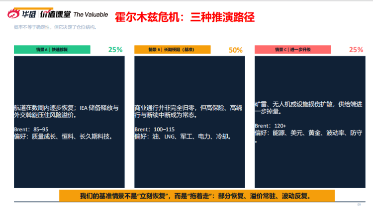 - 长期梗阻(50%,基准):航运高成本常态化,Brent运行于100–115美元,偏好油、LNG、军工、电力、冷却等资产;