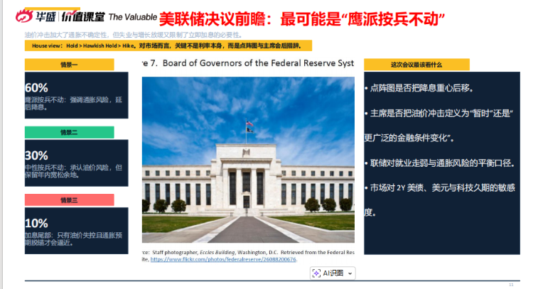 言财老师称面对油价冲击,联储更可能选择延后降息时点,而非仓促加息。他预判FOMC决议有60%概率为“鹰派Hold”——即承认通胀上行风险,但暂不调整利率,同时将2026年降息预期从Q2推迟至Q4。